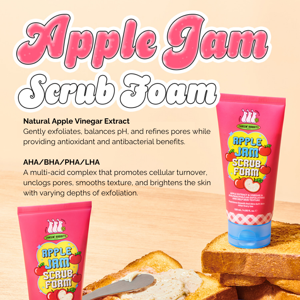 The Chasin Rabbits Apple Jam foaming scrub is formulated for everyday use, combining effective cleansing with skin-loving hydration. Enriched with Apple Extract—known for its purifying properties—it works to draw out impurities, gently exfoliate, and deeply cleanse while helping to maintain the skin’s natural moisture balance. The result is a refreshed, smooth, and radiant complexion.