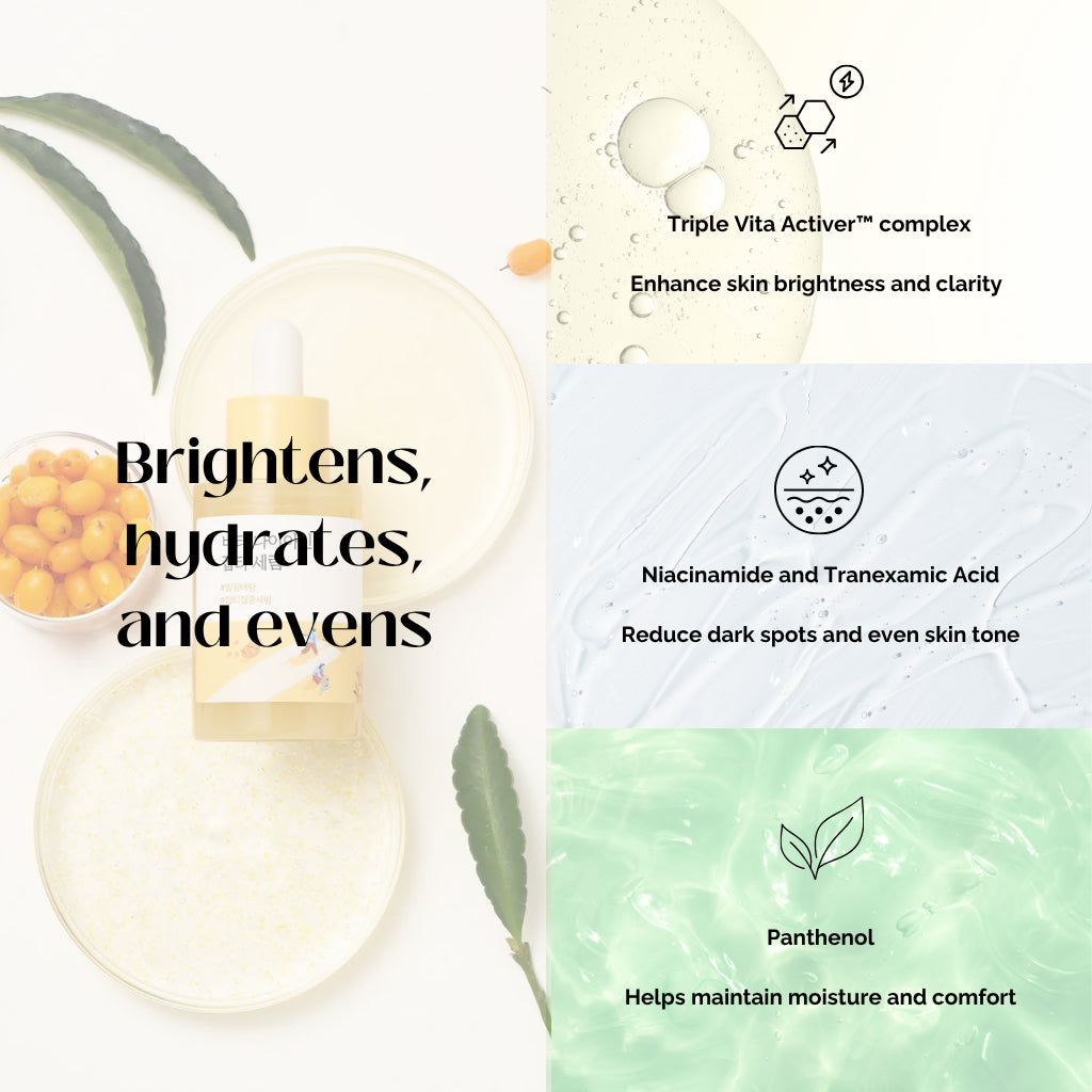 - Triple Vita Activer™ complex (Hippophae Rhamnoides Water, 3-O-Ethyl Ascorbic Acid, and Hippophae Rhamnoides Fruit Extract)